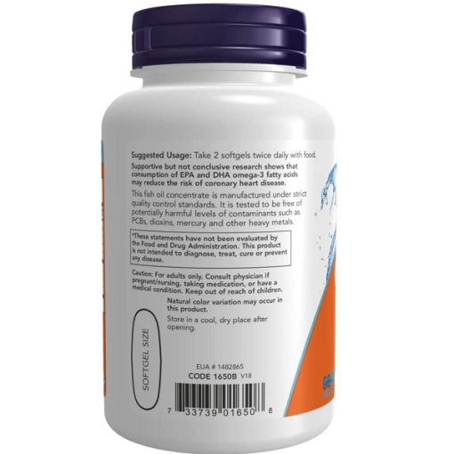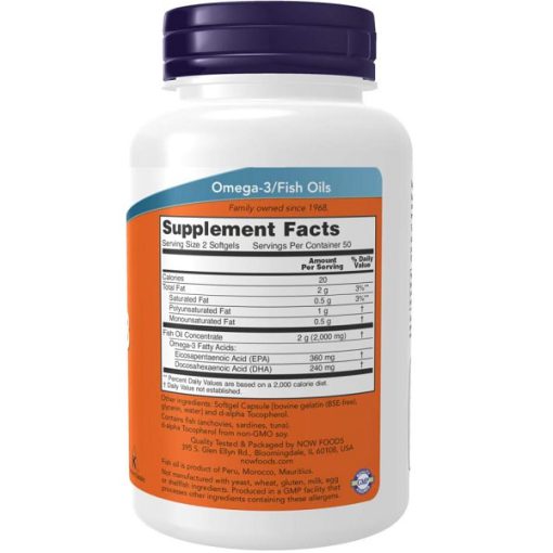 امگا 3 ناو 100 عدد NOW Foods Omega-3 از کنسانتره روغن ماهی طبیعی ساخته شده است و تحت استانداردهای کنترل کیفیت دقیق تولید می شود. این مکمل عاری از سطوح بالقوه مضر آلاینده هایی مانند PCB، دیوکسین، جیوه و سایر فلزات سنگین می باشد.