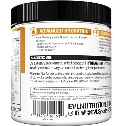 هیدرامینو ای وی ال EVL HYDRAMINO دارای فرمول کامل هیدراتاسیون است که تمام 6 الکترولیت را به علاوه اسیدهای آمینه مهم که مایعات را در سلول ها تقویت می کنند، همچننی آب نارگیل آبرسان، سبزیجات قلیایی، آنتی اکسیدان های طبیعی و ویتامین های B را تامین می کند تا آنچه که از طریق تعریق از دست می دهید را دوباره شارژ کنید.