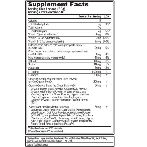 تمام 6 الکترولیت، آب نارگیل و تائورین برای سرعت بخشیدن به هیدراتاسیون تا سطح سلولی، به علاوه آنتی اکسیدان های مبتنی بر میوه و سبزیجات، و ویتامین های B و C برای افزایش ریکاوری و انرژی با HYDRAMINO فراهم می شود.