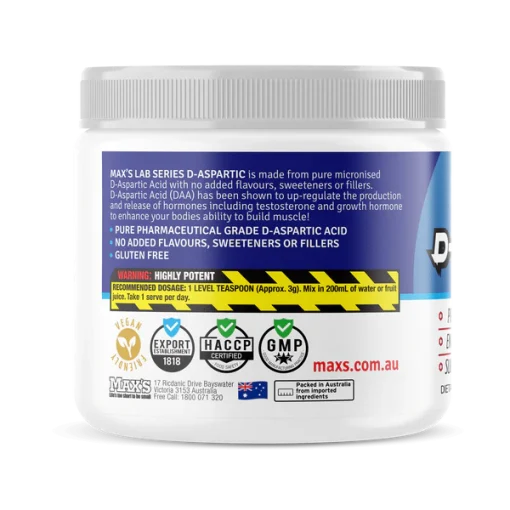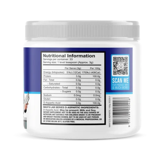 چگونه می توانم Max’s D-Aspartic را در روتین تناسب اندام خود بگنجانم؟ ساده است! روزانه 1 وعده از Max’s D-Aspartic، تقریباً 1 پیمانه (تقریباً 3 گرم)، مخلوط با 200 میلی لیتر آب یا آب میوه مصرف کنید. برای بهترین نتیجه، آن را 30 دقیقه قبل از تمرین مصرف کنید تا حداکثر فواید را تجربه کنید.