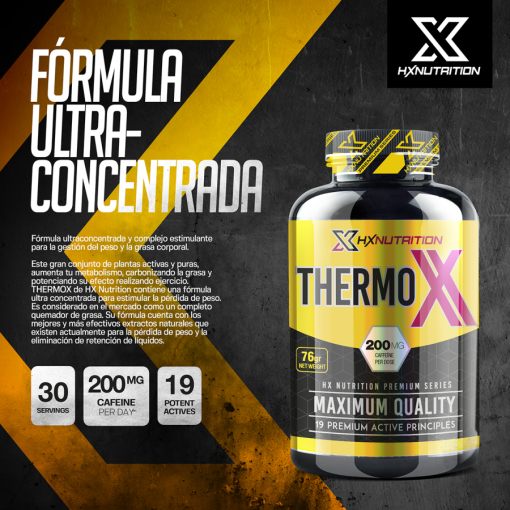 چربی سوز ترمو ایکس اچ ایکس نوتریشن HX Nutrition THERMOX یک مکمل دارای یک فرمول فوق العاده غلیظ برای کاهش وزن است. در بازار این محصول به عنوان یک چربی سوز کامل محسوب می شود. فرمول آن دارای بهترین و موثرترین عصاره های طبیعی است که در حال حاضر برای کاهش وزن و از بین بردن احتباس مایعات استفاده می شود. این مجموعه عالی از گیاهان فعال و خالص، متابولیسم شما را افزایش می دهد، چربی ها را کربن می کند و اثر آن را با ورزش افزایش می دهد.