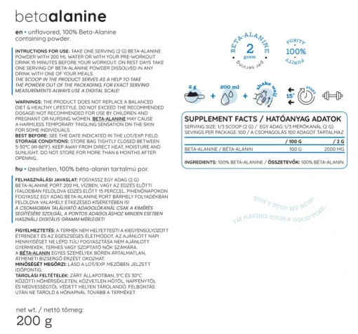 این محصول جایگزین یک رژیم غذایی متعادل و سبک زندگی سالم نیست و نباید از مقدار توصیهشده روزانه تجاوز شود. همچنین، مصرف آن برای کودکان، زنان باردار و شیرده توصیه نمیشود. برخی افراد ممکن است پس از مصرف بتا آلانین احساس سوزنسوزن شدن موقت و بیضرری در پوست خود تجربه کنند که این اثر جانبی طبیعی و گذرا است.