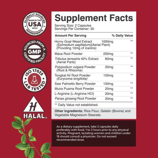 مکمل علف هرز بز شاخدار برای تقویت قوای مردانه حاوی 1590 میلی گرم عصاره تونکات علی، نخل اره ای مویرا پواما، جینسینگ پاناکس و ریشه ماکا سیاه برای استقامت و انرژی است