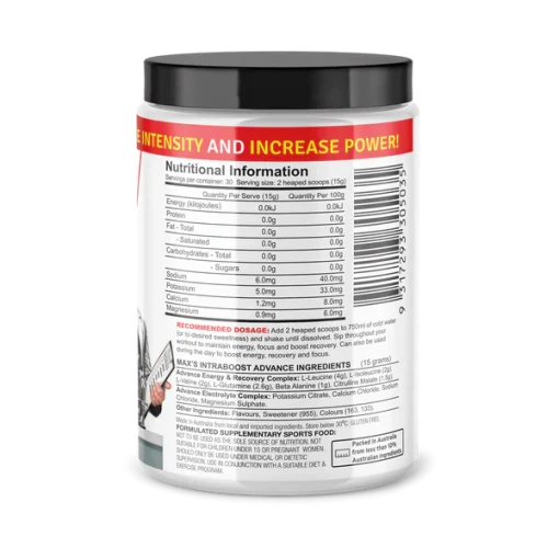 MAX’S IntraBoost Advance برای ورزشکاران و تمرینکنندگان سطح متوسط تا پیشرفته ساخته شده است که به دنبال افزایش شدت تمرینات و بهبود فرآیند بازیابی پس از تمرینات سخت هستند. این مکمل برای کسانی که به دنبال افزایش قدرت، استقامت، و تسریع بازیابی عضلات خود هستند، بسیار مناسب است.