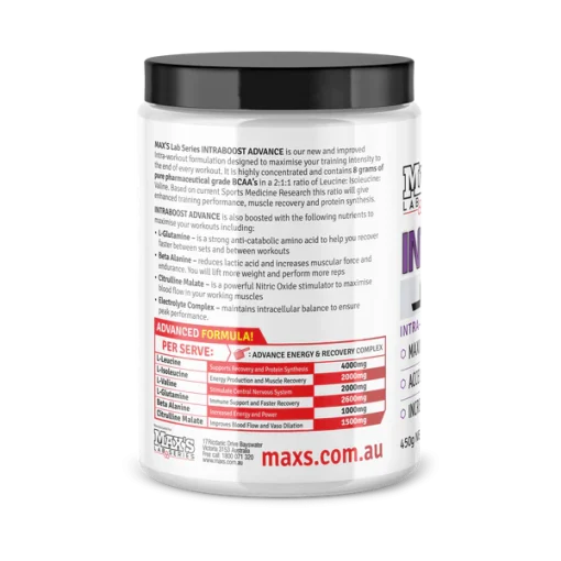 اینترا بوست ادونس مکسس MAX’s INTRABOOST ADVANCE یک مکمل پیشرفته است که برای بهبود عملکرد ورزشی و تسریع فرآیند ریکاوری ساخته شده است. این محصول به شما کمک میکند تا در طول تمرینات سخت، انرژی خود را حفظ کنید و عملکرد بهینهای داشته باشید. با استفاده از IntraBoost Advance، میتوانید بیشترین بهره را از هر تمرین ببرید و به سطح بالاتری از رشد و قدرت عضلانی دست یابید.