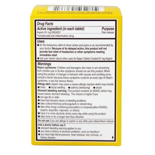 هر قرص آسپرین 81 میلی گرمی که به راحتی برای کسانی که مشکل بلع دارند، جویدنی است، همچنین فاقد کافئین و سدیم است. بایر آسپرین همچنین دردهای جزئی بدن را تسکین می دهد. هنگام مصرف برای درد، 4 تا 8 قرص را هر 4 ساعت با یک لیوان پر آب میل کنید. از 48 قرص در 24 ساعت تجاوز نکنید. طبق دستور استفاده کنید.