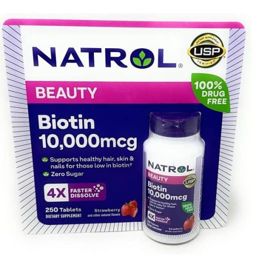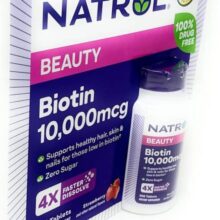 Natrol Biotin 10,000 mcg یک مکمل غذایی با دوز بالا از ویتامین B7 یا همان بیوتین است که برای کمک به سلامت سیستم عصبی، متابولیسم انرژی، حفظ سلامت پوست، مو و ناخنها طراحی شده است. این محصول در قالب قرصهای جویدنی (fast dissolve) ارائه شده که بدون نیاز به آب مصرف میشوند و جذب سریعتری نسبت به قرصهای معمولی دارند.