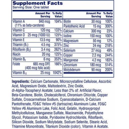مولتی ویتامین زنانه کامپلت ومن 300 عدد One-A-Day Women’s 50 plus حاوی ترکیباتی کامل از ویتامینها و مواد معدنی زیر است: